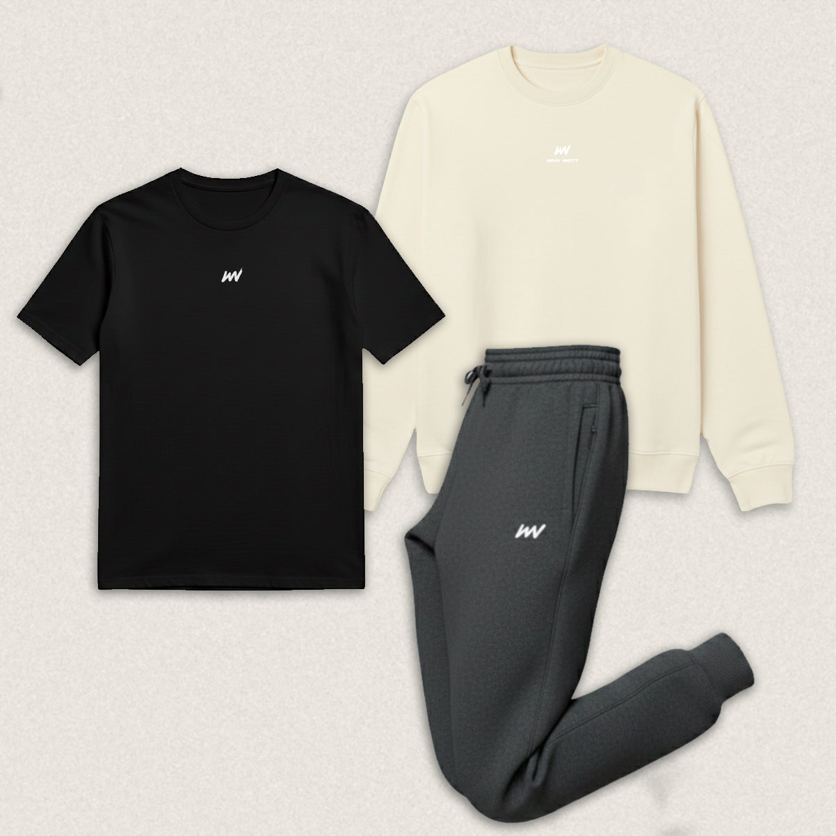 La WHY NOT? /07 Cream Sweater aporta comodidad y un tono crema fácil de combinar, el ORIGINALS /11 Grey Pants suma un pantalón largo sobrio que funciona igual de bien dentro y fuera del gym, y la ESSENTIAL /02 Black Core es la camiseta técnica negra que sirve para entrenar varias veces por semana. Juntos forman un kit que puedes ponerte por la mañana y no quitarte hasta que el día se acabe: gimnasio, calle y plan familiar, todo con el mismo conjunto.