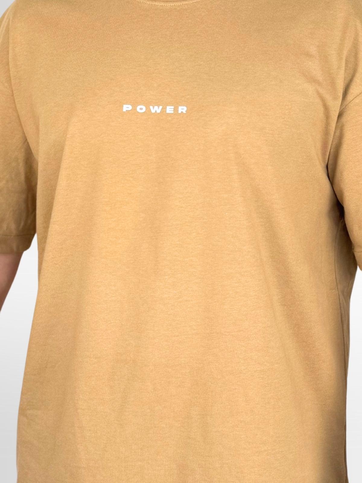El frontal lleva un discreto “POWER” centrado en el pecho. En la espalda, el mensaje toma protagonismo: