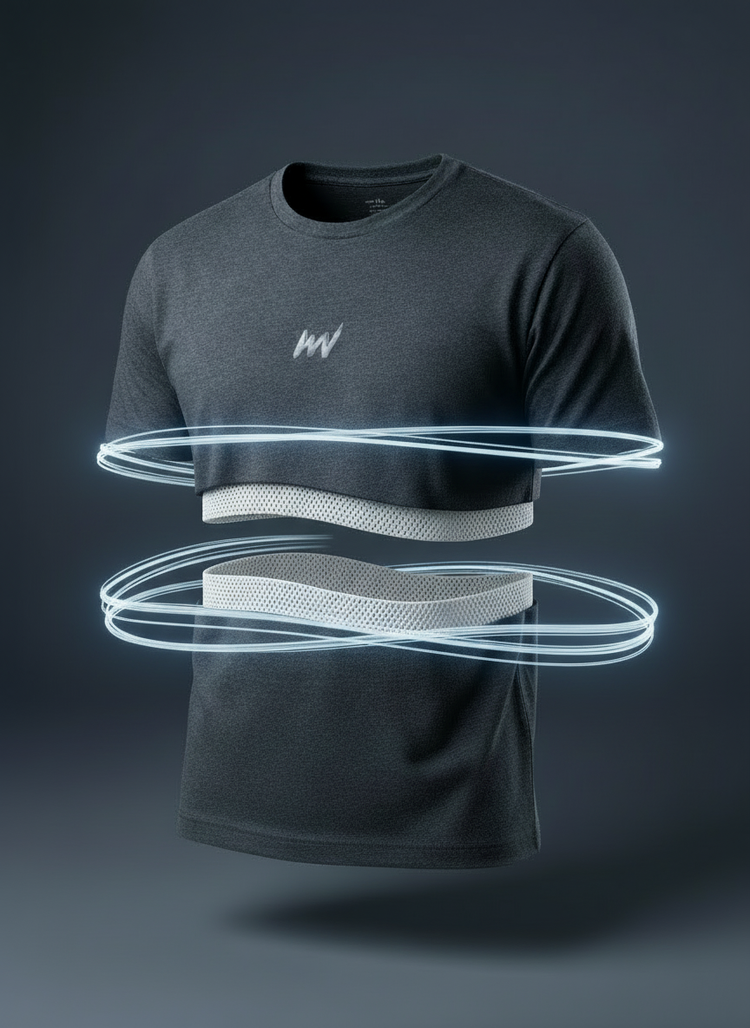 Tejido de 130 g/m² con estructura tri-blend: 50% poliéster para evacuación eficiente del sudor y estabilidad dimensional, 25% algodón para mejorar la absorción inicial y el confort térmico, y 25% viscosa para optimizar la caída, flexibilidad y tacto. El resultado es un equilibrio entre rendimiento mecánico y sensación natural sobre la piel.
